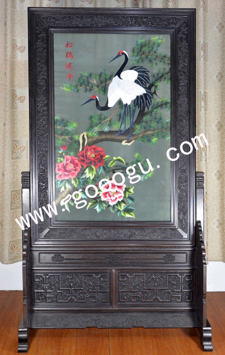 蘇繡玄關屏風 松鶴延年 手工刺繡 雞翅木 祝壽禮品 送長者